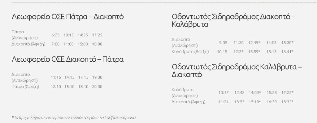 Με μια μοναδική διαδρομή περίπου μιας ώρας που ξεκινά από το Διακοπτό, ο οδοντωτός διασχίζει το φαράγγι του Βουραϊκού, περνά από το χωριό Ζαχλωρού και καταλήγει στα Καλάβρυτα. Η διαδρομή 22 χιλιομέτρων που διανύει πραγματοποιείται με ταχύτητα που κυμαίνεται από 30 έως 40 χλμ/ώρα στην απλή γραμμή και από 6 έως 15 χλμ/ώρα στο οδοντωτό κομμάτι.